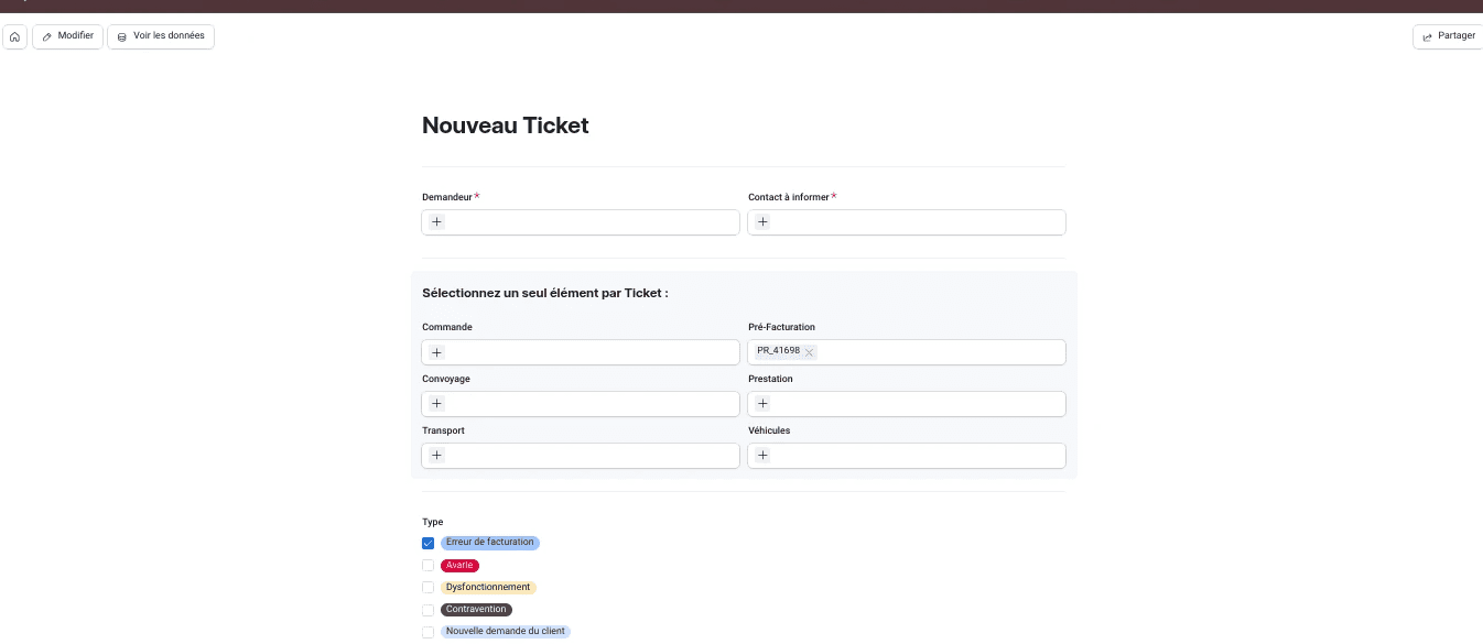 Les utilisateurs peuvent émettre des tickets directement depuis une ligne de prestation ou de facturation pour poser une question au chargé de relation client.