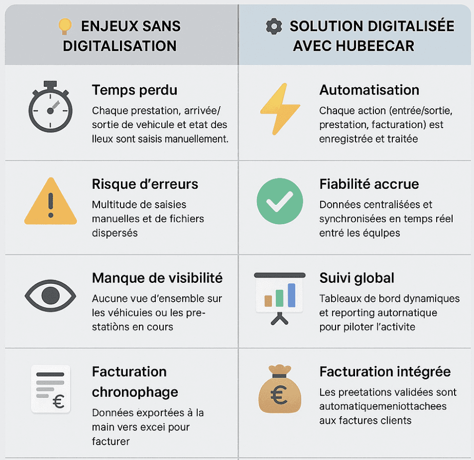 ⏱️ Temps perdu : Chaque prestation saisie manuellement : arrivée/sortie des véhicules, états des lieux, prestations réalisées… Des heures de travail perdues chaque jour pour chaque collaborateur.